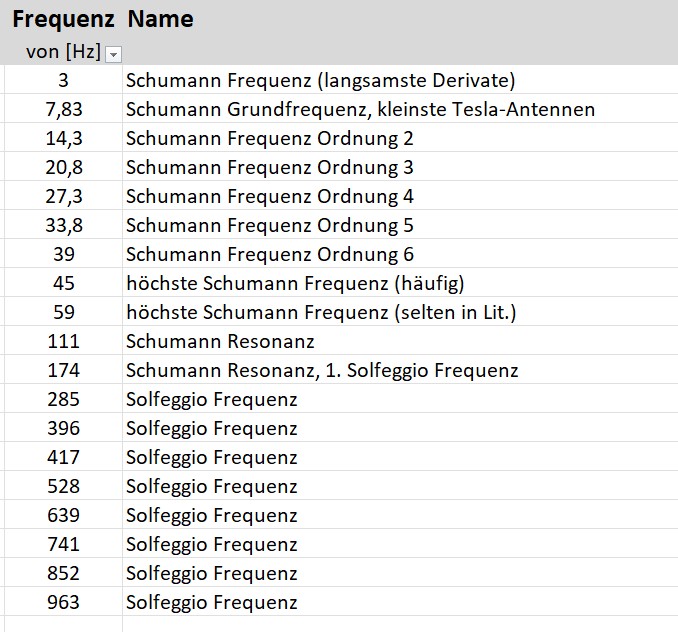 Solfeggios und Schumanns Frequenzen in Hertz.